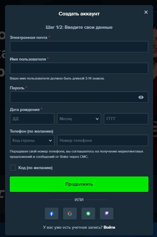 Регистрация на площадке Stake casino доступна всем совершеннолетним пользователям, которые заполнят небольшую анкету. Чтобы создать личный кабинет, новичкам необходимо: